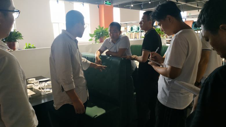 隨后,周經理帶領新伙伴挨個對展廳里面的餐桌椅及電動餐桌和卡座沙發做了深入講解,現場不明白的問題新員工也都及時的得到了清晰地答復。在后面的互動環節,周經理還隨機點名讓新員工對展廳里面的餐桌的材質進行回答,還包括電動餐桌的尺寸計算,餐椅配備數量計算等基礎問題進行了考核,大家的回答幾乎都是正確的。