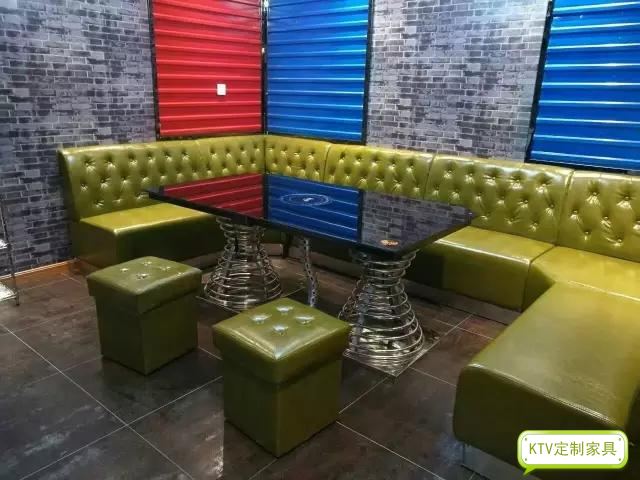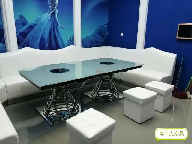 卡座沙發采用的是油蠟皮,價格實惠,雖然沒有超纖皮那么結實耐用,但也是對得起他的價格的。茶幾結合時尚與實用,采用不銹鋼管焊制的底架,也很好的解決了電磁爐的線路問題,臺面采用焗油玻璃,既有KTV應有的時尚,也解決了餐飲所要的實用。款式的多樣性,使得工廠放樣師傅也是費了一番功夫,索性效果也是預期的好,可見我們的放樣師記憶之高超。