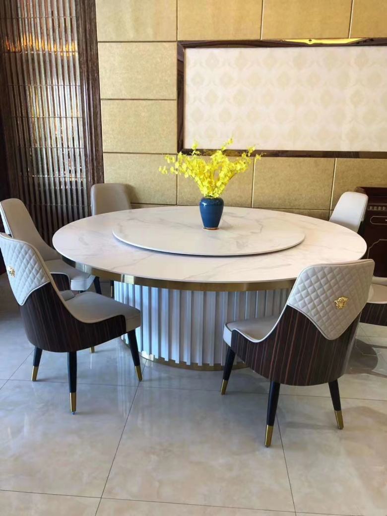 工廠業務經理打開效果圖,仔細看了一遍餐桌椅的材質要求和款式搭配,餐桌主要以大理石桌面為主,餐椅要求使用高回彈海棉和優質皮革,另外還有部分弧形卡座沙發以及博古架等配套家具。業務經理表示,自助餐廳使用大理石餐桌非常好,油漬好清理。而且,去自助餐廳就餐的顧客一般都會花費比一般快餐店長的時間享受美食,因此,餐椅的舒適性也很重要!