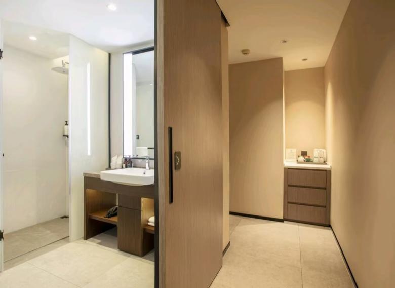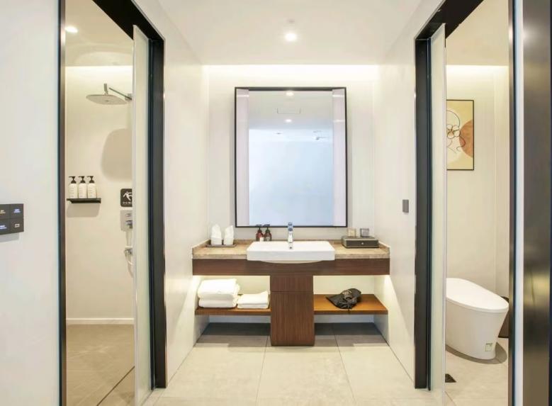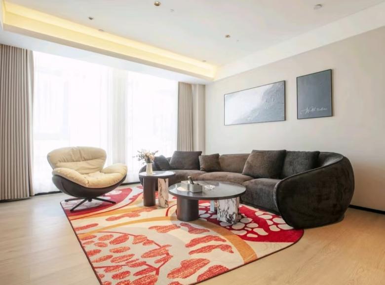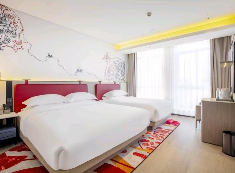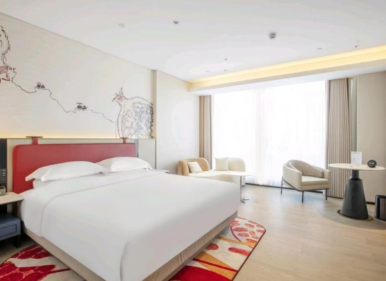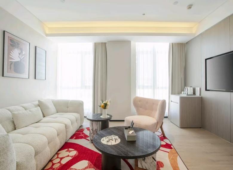 平涼歡閱酒店環保性好,床、柜等選用E0級板式家具,移動家具則由我廠負責搭配設計,與客房整體風格協調,并且更好的提升了室內空間的氛圍感和時尚感。