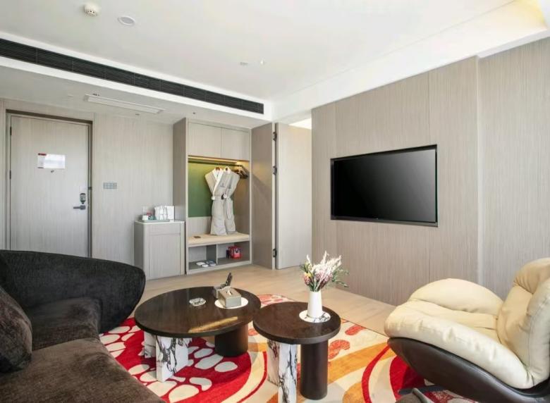 平涼歡閱酒店定位經濟型酒店,2024年年底裝修,2025年對外試營業。該酒店項目家具由我廠完成定制生產,家具包括大堂沙發、茶幾、展柜、客房入戶門、衣柜、茶水柜、電視框、浴室柜、床屏、床箱、床頭柜、客房沙發茶幾、寫字桌椅、休閑椅。
